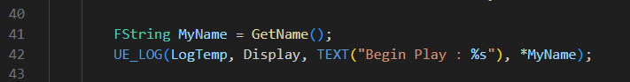 Fstring의 변수 앞에 * 연산자를 넣어줘야하는데 그 이유는 UE_LOG의 세번자 인자는 printf의 형식으로 출력한다.
