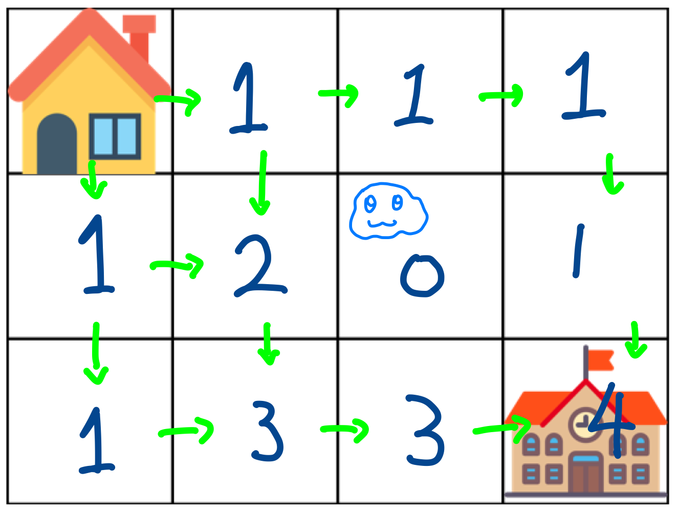집[1,1]부터 [1,2]로 가는 길은 하나 밖에 없다.