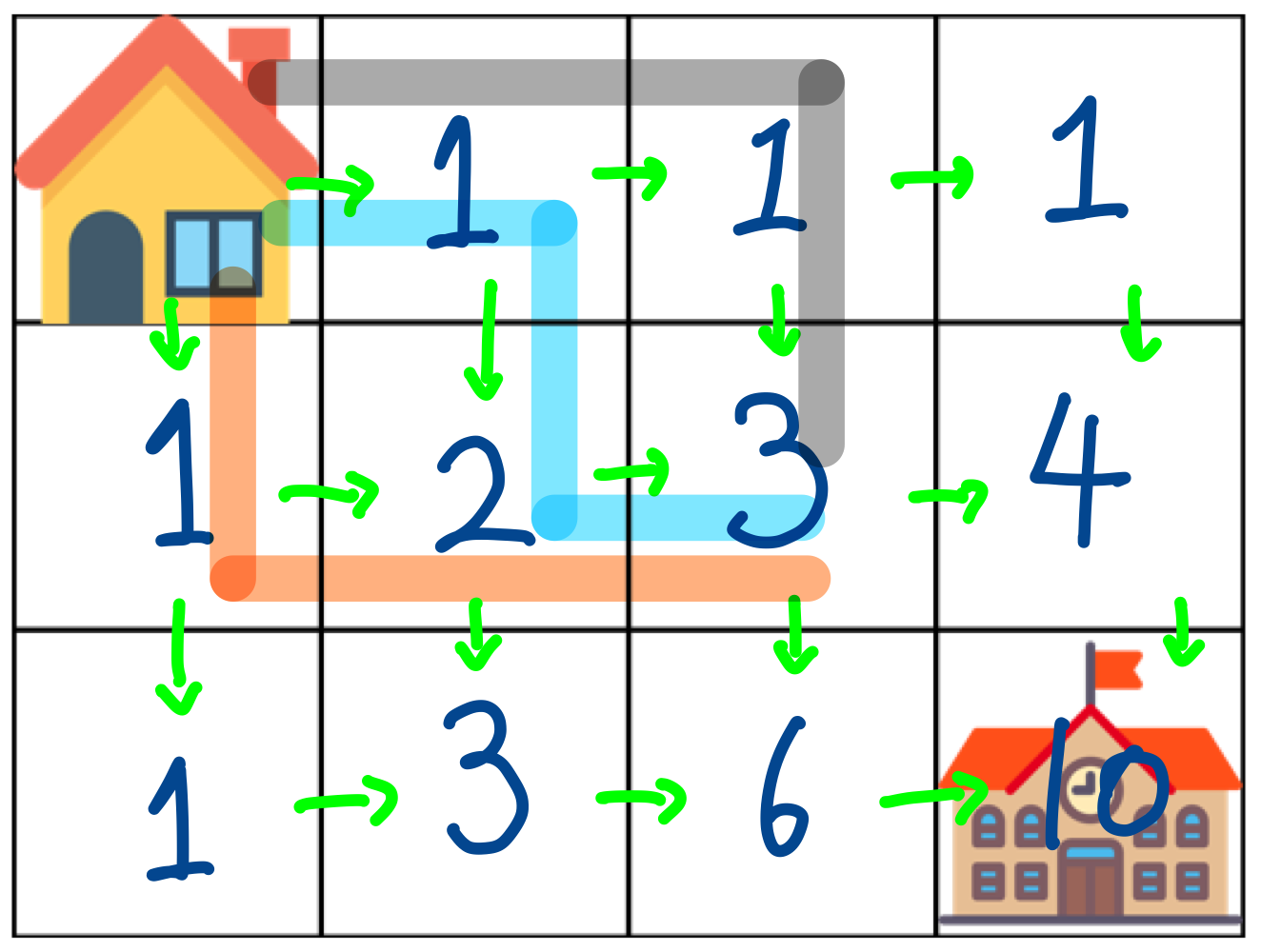 [3,2]의 경우의 수를 보면 [1,3]에서 아래로 내려가는 것과