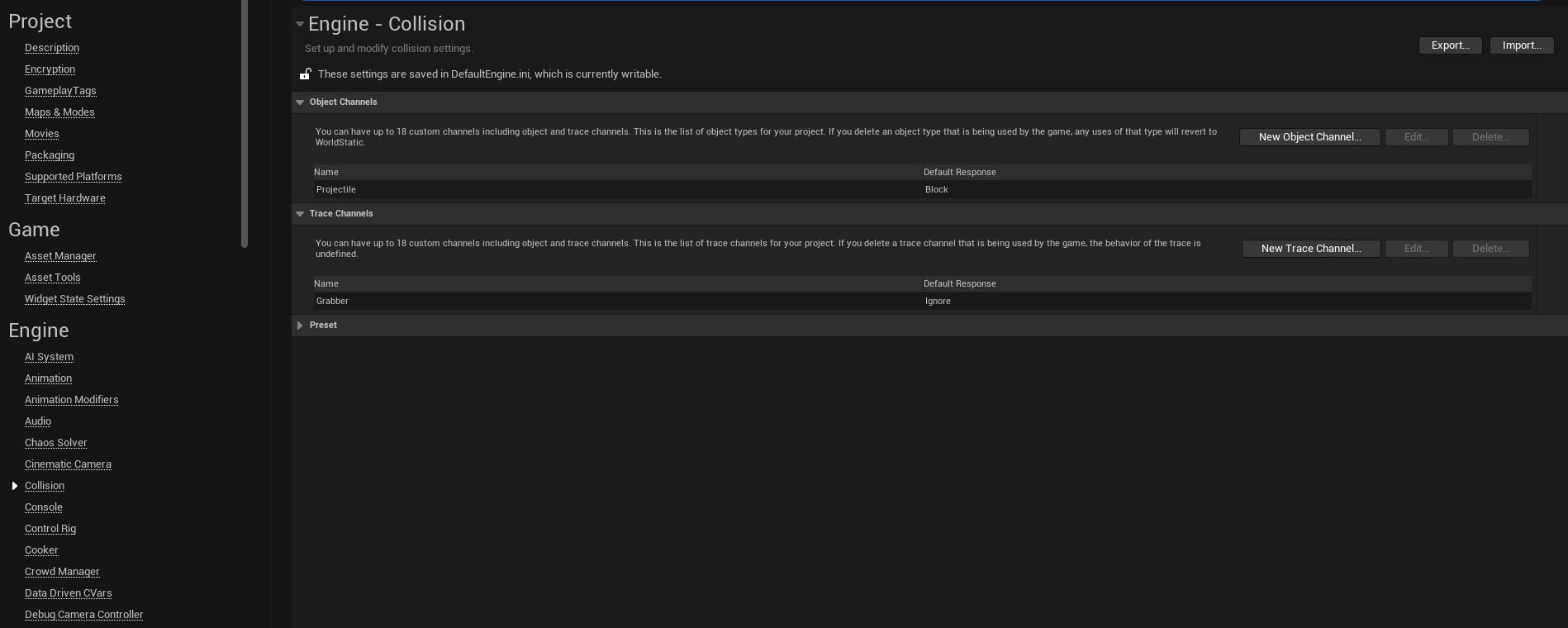 Trace Channel은 Edit -> Project Settings -> Engine -> Collision에서 설정 가능하다.