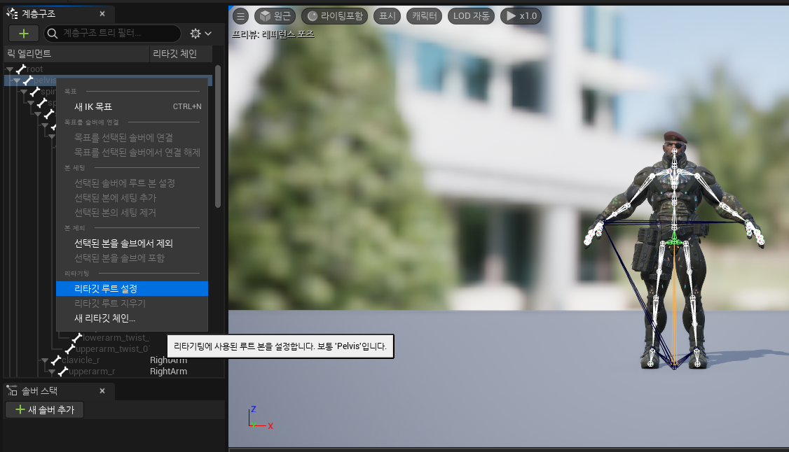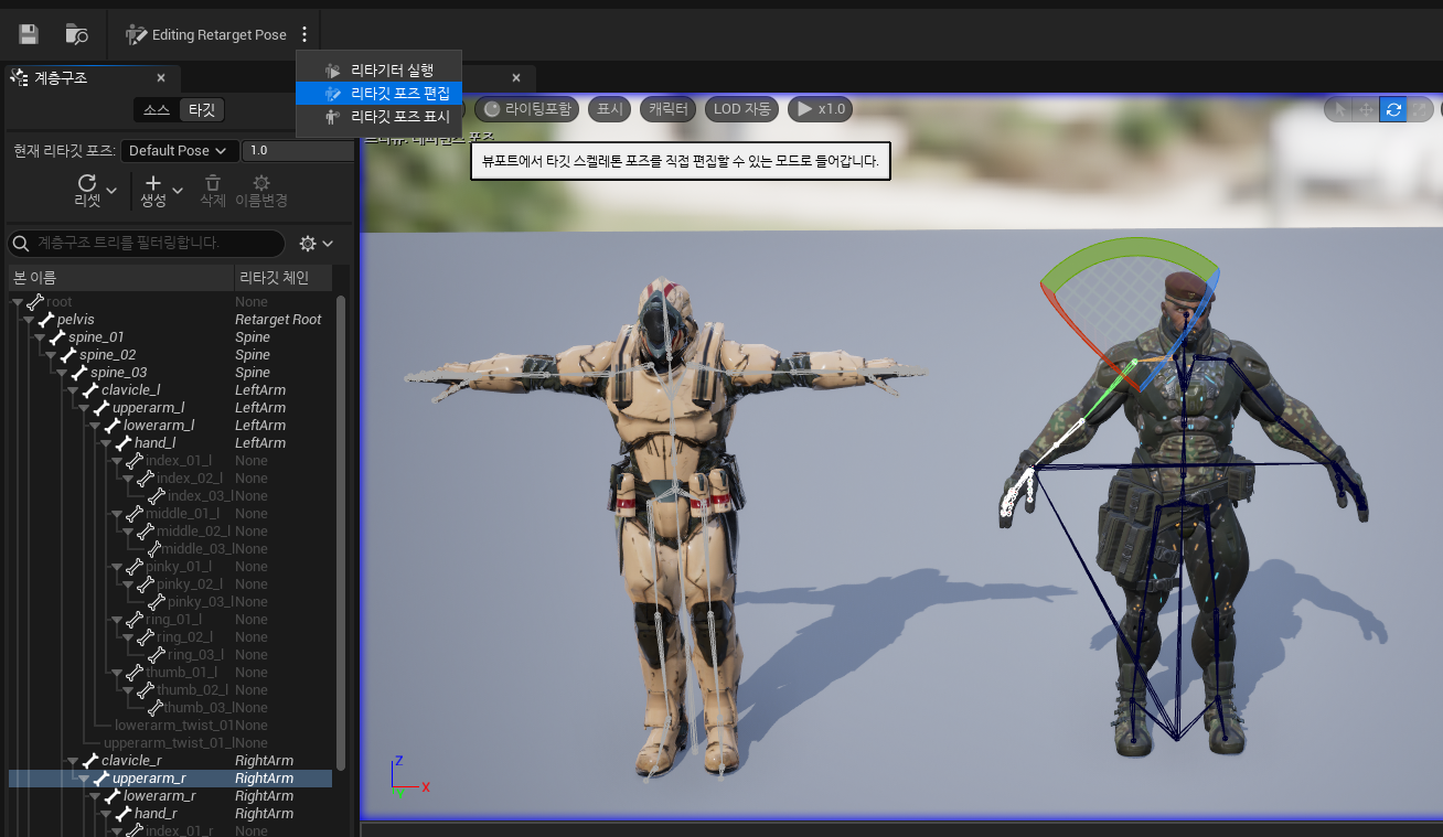 또 강의와 나의 UE5 UI가 조금 달라서 헷갈렸는데 찾아보니 리타깃 포즈 편집은 위쪽으로 이사를 갔다..