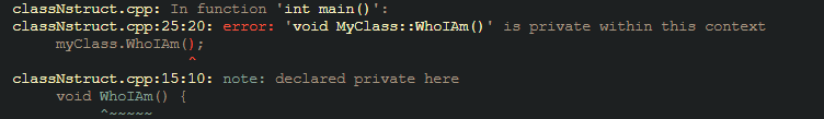 접근 지정자를 명시적으로 지정하지 않은 멤버 함수에 접근하려고 하면 오류 메세지를 띄운다.