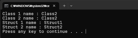 Console.WriteLine($"Struct 2 name : {struct2.name}");