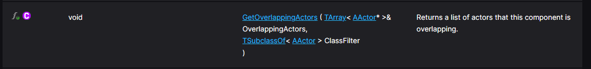 실제로 반환값은 void 이지만 Parameter에 TArray<AActor*>& OverlappingActors 로