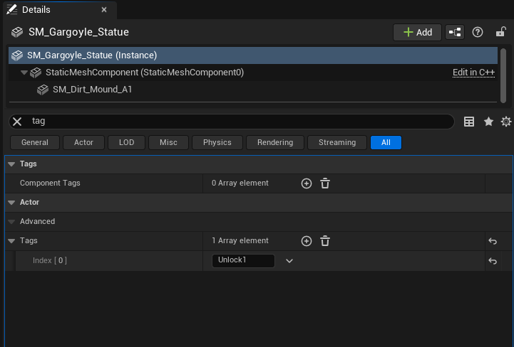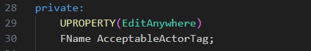 UPROPERTY를 사용하여 Tag를 에디터에서 설정할 수 있게 한다.