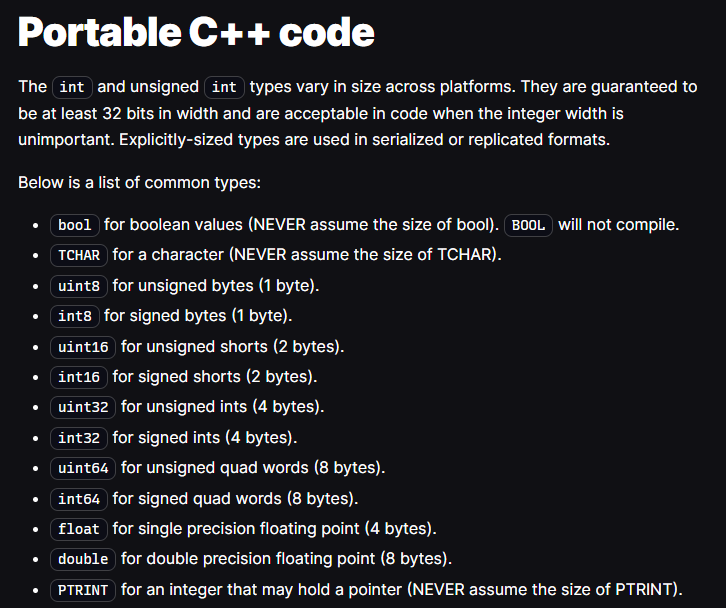 언리얼에서 int를 int32와 같이 크기가 고정된 정수 타입을 사용하는 것이 일반적이라 한다.