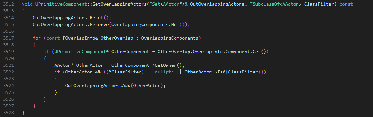 GetOverlappingActors(TSet<AActor*>& OverlapSet)을 호출한다는 점이다.