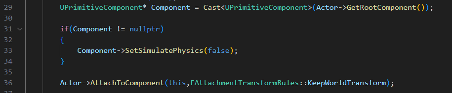 참고 링크 : UPrimitiveComponent::SetSimulatePhysics(), AActor::GetRootComponent(), AActor::AttachToComponent(), FAttachmentTransformRules