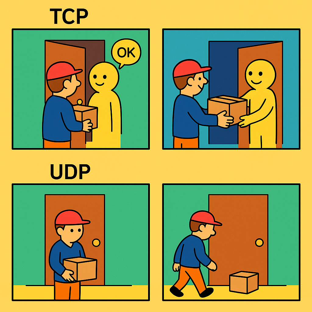쉽게 말해, 애플리케이션(게임, 웹 등)이 보내려는 데이터를 목적지까지 안전하고 효율적으로 전달하는 중간 관리자라고 볼 수 있다. TCP와 UDP는 이 역할을 서로 다른 방식으로 수행한다.